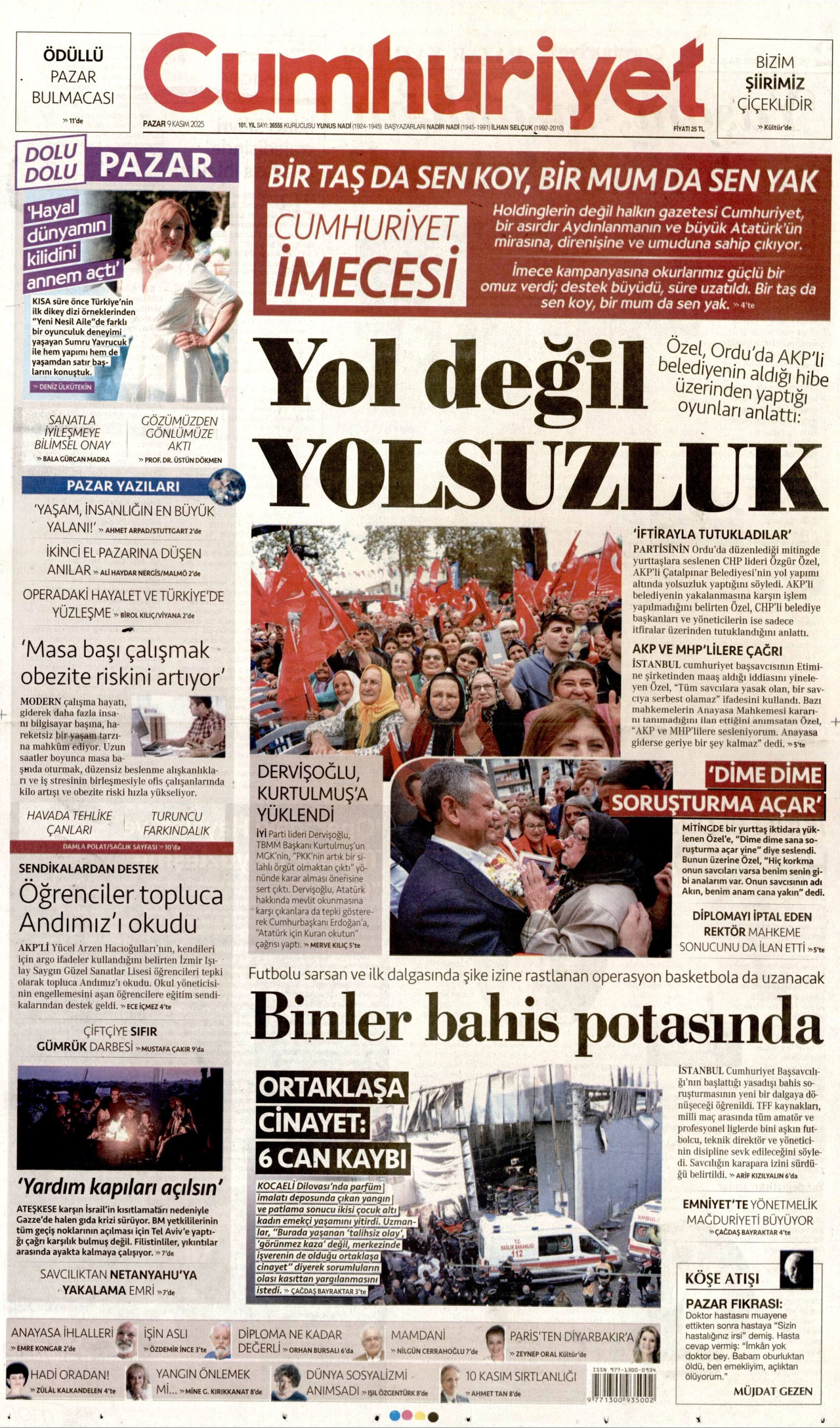 CUMHURİYET Gazetesi 09 Kasım 2025, Pazar Günü Manşeti